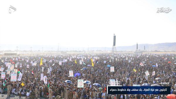 ونددت الحشود بالعدوان الصهيوني الإرهابي على المنشآت والأعيان المدنية في العاصمة صنعاء والحديدة.. مجددة التأكيد على أن هذا العدوان لن يثني الشعب اليمني عن موقفة الثابت والمبدئي عن نصرة الأشقاء في غزة وكل فلسطين.