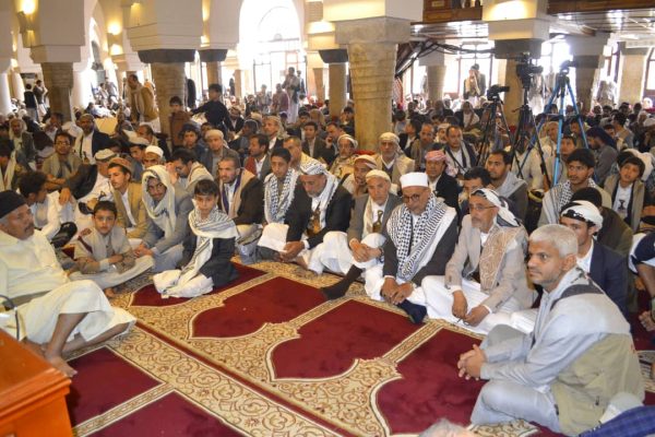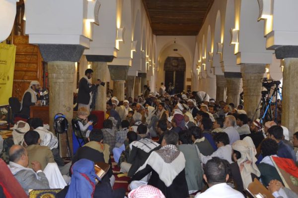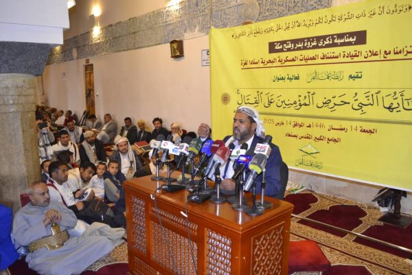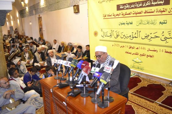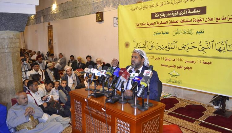 نظمّت رابطة علماء اليمن اليوم بالجامع الكبير في صنعاء فعالية خطابية بعنوان “يا أيها النبي حرض المؤمنين على القتال”، بمناسبة ذكرى غزوة بدر وفتح مكة.