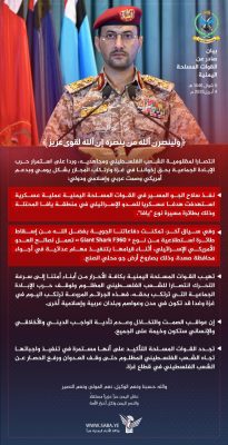 وأهابت القوات المسلحة اليمنية بكافة الاحرار من أبناء امتنا لسرعة التحرك انتصارا للشعب الفلسطيني المظلوم، مجددةً التأكيد على استمرارها في تنفيذ واجباتها تجاه الشعب الفلسطيني المظلوم حتى وقف العدوان ورفع الحصار عن غزة.