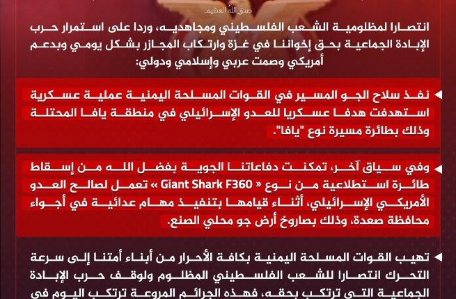 وقال متحدث القوات المسلحة اليمنية العميد يحيى سريع في بيانٍ متلفزٍ اليوم الجمعة: إن “سلاح الجو المسير نفذ عملية عسكرية استهدفت هدفا عسكريا للعدو الإسرائيلي في منطقة يافا المحتلة بطائرة مسيرة من نوع يافا، مشيرًا إلى أن دفاعاتنا الجوية تمكنت من إسقاط طائرة استطلاعية من نوع Giant Shark F360 بصاروخ أرض جو محلي الصنع في محافظة صعدة”.