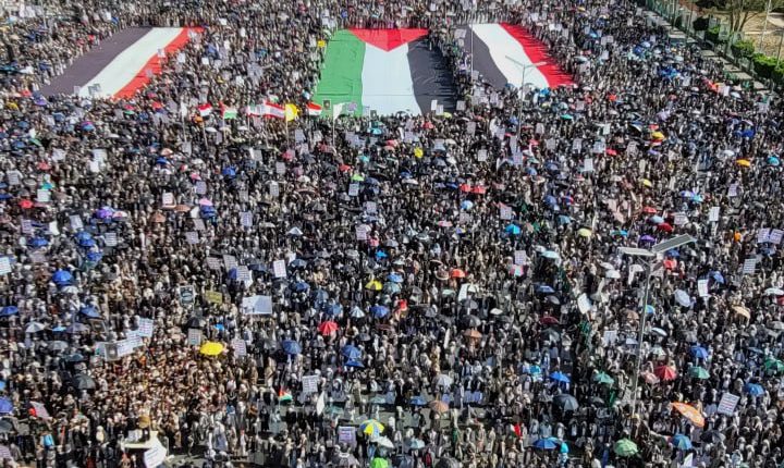 مسيرة مليونية بالعاصمة صنعاء تحت شعار “مع غزة.. لمواجهة جريمة الإبادة والتجويع”