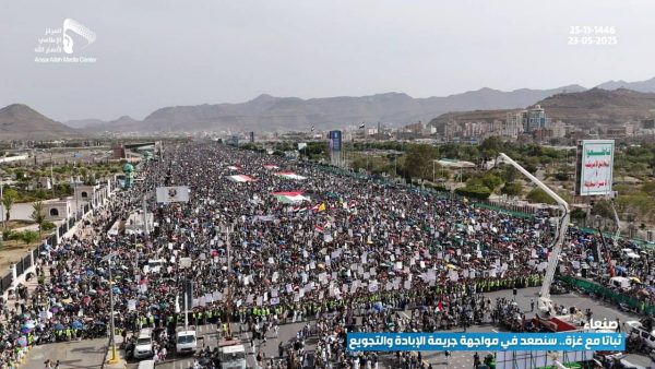 واستنكرت الحشود المليونية، التواطؤ والتخاذل العربي والإسلامي ومواقف الخزي والعار للمطبعين إزاء جريمة الإبادة والتجويع التي يتعرض لها الأشقاء في غزة أمام مرأى ومسمع العالم أجمع.وأعلنت الجماهير، تأييدها ومباركتها للعمليات البطولية التي تنفذها القوات المسلحة اليمنية ضد الأهداف الحيوية للعدو الإسرائيلي في عمق الأراضي المحتلة، وما تفرضه من حظر شامل على المطارات والموانئ الصهيونية.
