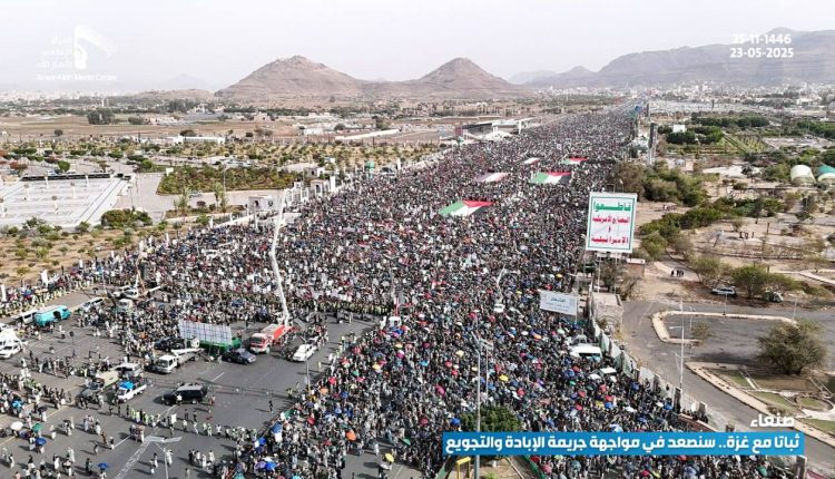ففي العاصمة صنعاء شهد ميدان السبعين طوفاناً بشرياً تأكيداً على ثبات موقف اليمن المساند للشعب الفلسطيني وقضيته العادلة، وتنديدا بالتواطؤ والتخاذل العربي والإسلامي إزاء جريمة الإبادة والتجويع التي يتعرض لها الأشقاء في غزة أمام مرأى ومسمع العالم أجمع.
