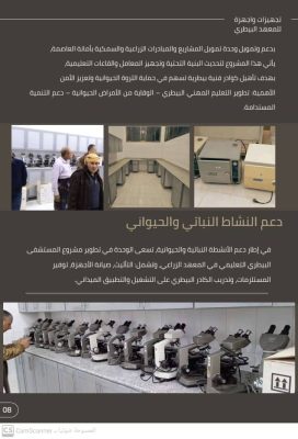 وشملت المشاريع أيضا المرحلة الثانية من دعم أنشطة القطاع النباتي والحيواني في المعهد البيطري الزراعي (أعمال صيانة وتأثيث وتشغيل معدات المستشفى البيطري التعليمي الحديث)، وتوفير الأدوات والمواد اللازمة للأجهزة الطبية وتدريب وتأهيل الكادر البيطري على استخدامها.