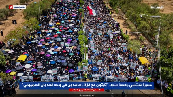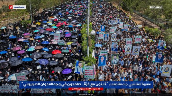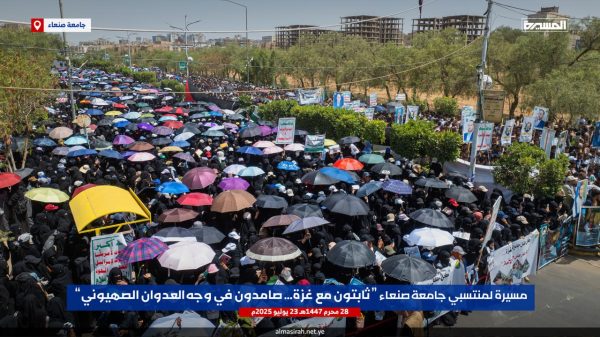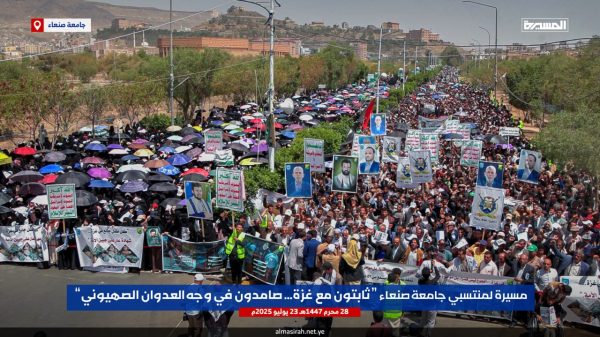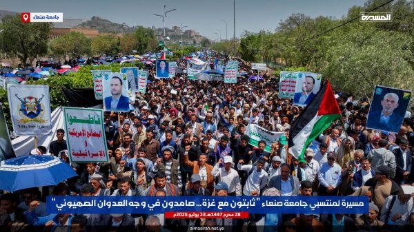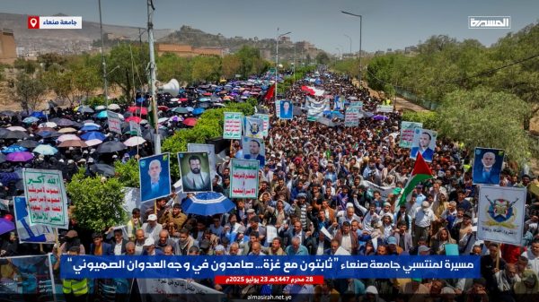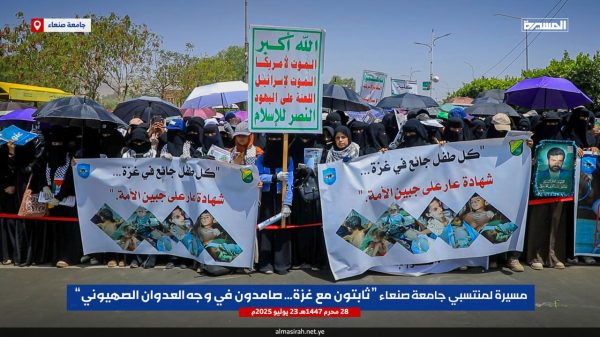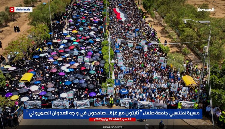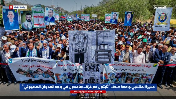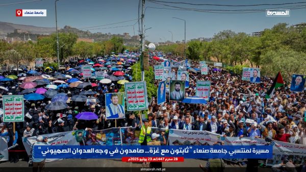 ونددت الحشود في مسيرة ” ثابتون مع غزة صامدون في وجه العدوان الصهيوني” التي شارك فيها رئيس جامعة صنعاء الدكتور محمد البخيتي، وقيادات الجامعة وعمداء الكليات ومنتسبيها من أكاديميين وإداريين وطلبة، بإمعان العدو الإسرائيلي الأمريكي في ارتكاب أبشع جرائم التجويع والإبادة الجماعية للشعب الفلسطيني في قطاع غزة والتدمير الشامل والتجريف للمدن والأحياء السكنية وتدمير كل مقومات الحياة، أمام مرأى ومسمع من العالم أجمع.