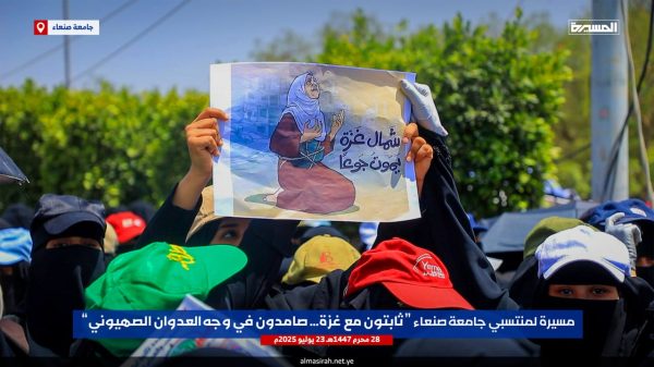 خرج الآلاف من منتسبي جامعة صنعاء اليوم، في مسيرة احتجاجية غاضبة تنديداً بجريمة التجويع والإبادة الجماعية التي يرتكبها الكيان الصهيوني بحق سكان غزة، واستجابة للنداء الذي أطلقته حركة المقاومة الإسلامية حماس للمجتمع الدولي وأحرار العالم، للخروج في أوسع تحرك جماهيري في مختلف عواصم ومدن العالم.