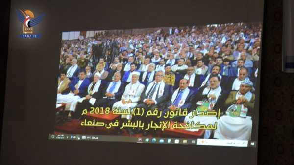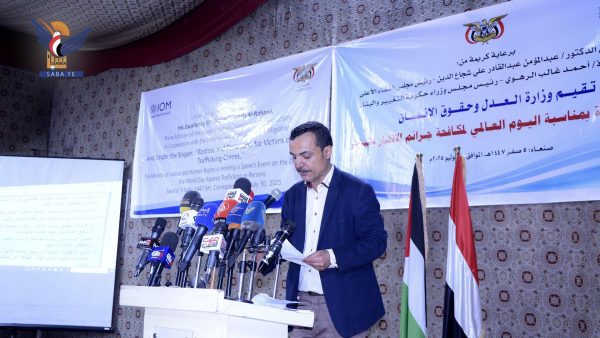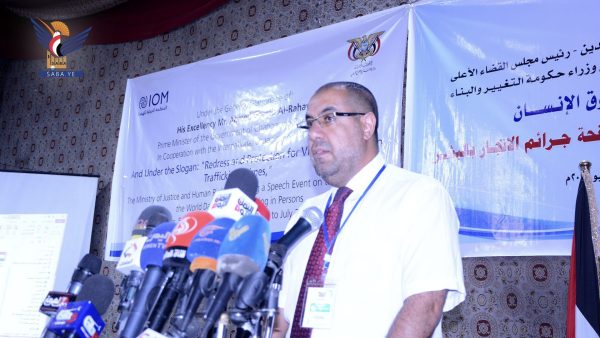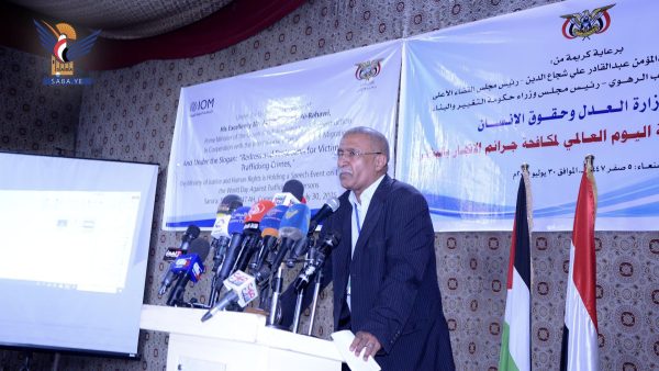 وفي الفعالية التي حضرها النائب الأول لرئيس الوزراء العلامة محمد مفتاح، ونائب رئيس مجلس الشورى محمد الدرة، ووزراء العدل وحقوق الإنسان القاضي مجاهد عبدالله، والنفط والمعادن الدكتور عبدالله الأمير، والإعلام هاشم شرف الدين، والنائب العام القاضي عبدالسلام الحوثي، ومستشار المجلس السياسي الأعلى السفير عبدالإله حجر، ونائب وزير الشباب والرياضة نبيه أبو شوصاء، وعدد من أعضاء مجلس الشورى، أكدت كلمة وزير العدل وحقوق الإنسان التي ألقاها نائب الوزير القاضي إبراهيم الشامي، أن خطورة جريمة الاتجار بالبشر تكمن في اتساع رقعة انتشارها كجريمة منظمة عابرة للحدود، يمتد تأثيرها إلى كافة المجتمعات والدول.