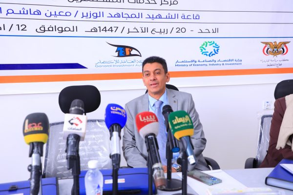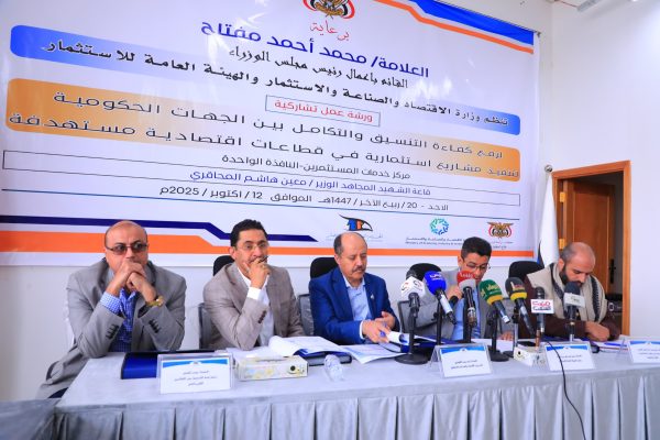 وفي كلمته بالورشة التشاركية التي نظمتها وزارة الاقتصاد والصناعة والإستثمار والهيئة العامة للإستثمار اليوم بصنعاء بعنوان ” لرفع كفاءة التنسيق والتكامل بين الجهات الحكومية لتنفيذ مشاريع استثمارية في قطاعات استثمارية مستهدفة “.