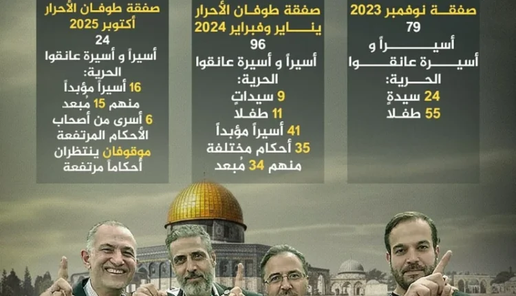 وأضاف أن صفقة “طوفان الأحرار” يناير وفبراير 2024 شملت الإفراج عن 96 أسيراً وأسيرة، بينهم 9 نساء و11 طفلاً، و41 أسيراً مؤبداً، و35 آخرين بأحكام مختلفة، تم ترحيل 34 منهم خارج الوطن.