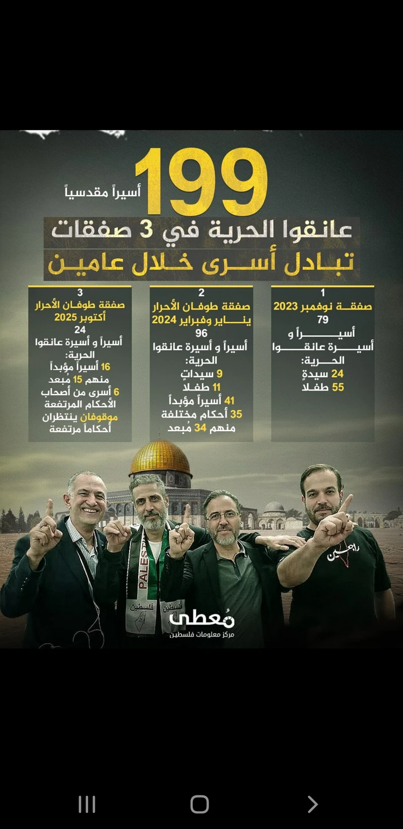 أفاد مركز معلومات فلسطين (معطى)، اليوم الثلاثاء، بأن 199 أسيراً مقدسياً عانقوا الحرية خلال عامين عبر ثلاث صفقات تبادل مع العدو الإسرائيلي.