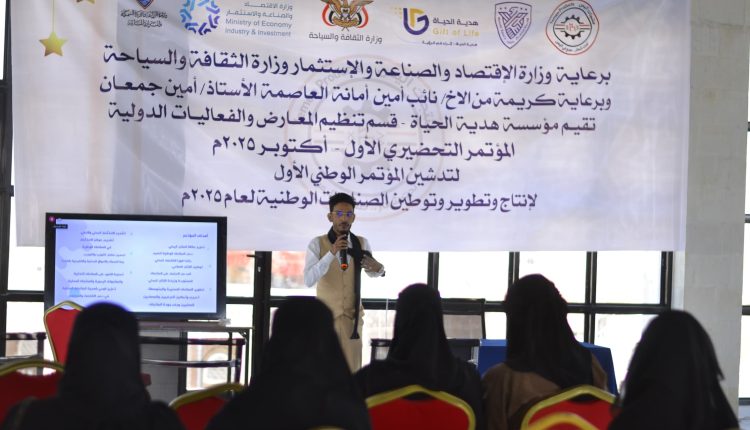 عُقد بصنعاء، اليوم، لقاء تحضيري للمؤتمر الوطني الأول لإنتاج وتطوير وتوطين الصناعة الوطنية 2025م الذي تنظمه مؤسسة هدية الحياة لتنظيم المعارض والمؤتمرات الدولية بإشراف وزارات الاقتصاد والصناعة والثقافة والسياحة والزراعة والثروة السمكية والموارد المائية.