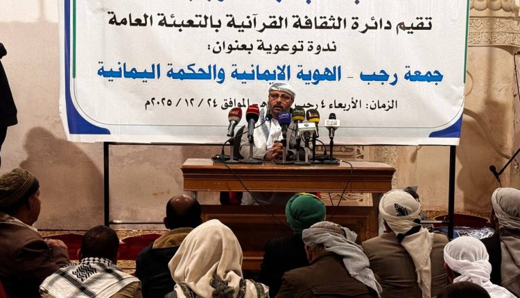 وتطرقت الندوة إلى الأبعاد الدينية والتاريخية لجمعة رجب، وما تمثله من محطة إيمانية مهمة في وجدان الشعب اليمني، باعتبارها مناسبة مرتبطة بدخول الإمام علي بن أبي طالب عليه السلام إلى اليمن، وترسيخ معاني الإيمان والحكمة التي امتاز بها اليمنيون، كما ورد في الحديث النبوي الشريف “الإيمان يمانٍ والحكمة يمانية”