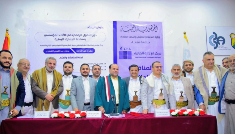 نال الباحث عدنان عبدالكريم الغفاري درجة الماجستير التنفيذي بامتياز في الإدارة العامة من مركز الإدارة العامة بجامعة صنعاء عن رسالته الموسومة بـ “دور التحول الرقمي في الأداء المؤسسي بمصلحة الجمارك”.