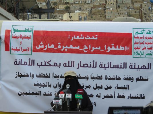 وطالب بيان صادر عن الوقفة بسرعة الإفراج عن سميرة مارش وإعادتها إلى أهلها .. داعياً الأمم المتحدة ومبعوثها إلى اليمن القيام بالدور الانساني والحقوقي تجاه هذه القضية وكافة قضايا الانتهاكات التي ترتكبها دول العدوان بحق نساء وأطفال اليمن.