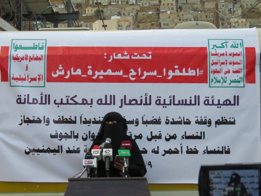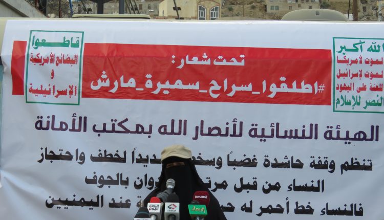 نددت حرائر أمانة العاصمة باختطاف مرتزقة العدوان سميرة حزام مارش من منطقة حزم الجوف منذ عام ونصف.
