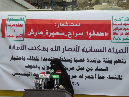 واعتبرت في وقفة احتجاجية، نظمتها الهيئة النسائية لأنصار الله بأمانة العاصمة، اليوم أمام مكتب الأمم المتحدة بصنعاء، هذا العمل المشين، جريمة تتنافى مع الأعراف والمواثيق والقانون الدولي الإنساني.